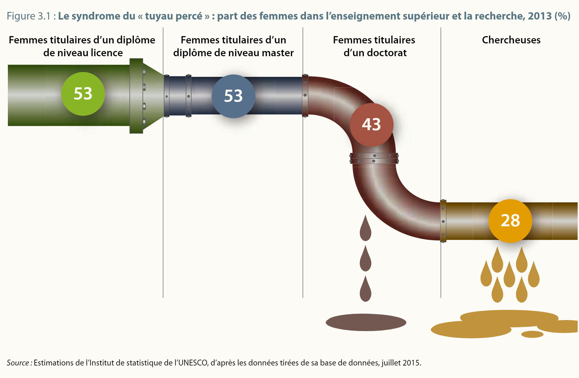 Cela étant dit, si les femmes sont légèrement majoritaires dans certains programmes de baccalauréat et de maîtrise en sciences, on les retrouve en beaucoup moins grand nombre au niveau du doctorat, et l’écart se creuse encore plus en recherche. Souvent qualifiée de « phénomène du tuyau percé » (UNESCO, 2015), cette fuite de talents se remarque dans toutes les statistiques sur les femmes et la recherche en STIM dans le monde.